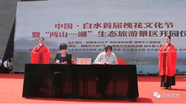 当天的开园仪式由陕西省文化厅、陕西省旅游局、渭南市人民政府联合主办,由渭南市文体广电局、渭南市文物旅游局、白水县人民政府承办。 开园仪式上,白水县与陕旅集团、清华长三角研究院、上海红星美凯龙、北京翠微国际旅游有限公司、浙江九天建设有限公司分别签定《仓颉庙中华上古文化产业园核心片区项目开发战略合作协议》、《合作共建创新创业促进中心项目协议》、《爱琴海项目合作意向协议》、《陕西白水华夏四圣文化研学旅行教育基地合作协议》、《“两山一湖”慢城旅游区开发项目协议》。 嘉宾们还前往方山腹地,赏槐林美景、品槐花美食,参观白水电子商务产品展;出席研讨会,共商“两山一湖”景区提升发展。